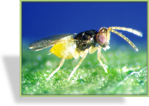 Aus den Puppen schlüpfen die Gegenspieler der Weißen Fliege: Die Schlupfwespen Encarsia formosa (im Bild ein ausgewachsenes Insekt)