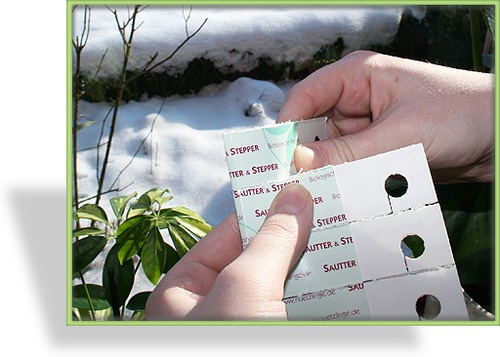 Die Schlupfwespen-Puppen befinden sich im Inneren der Kärtchen. Die Schlupfwespen krabbeln von allein daraus hervor. Kärtchen nicht aufreißen!