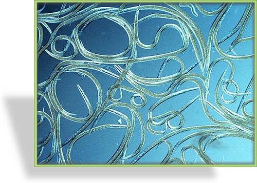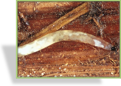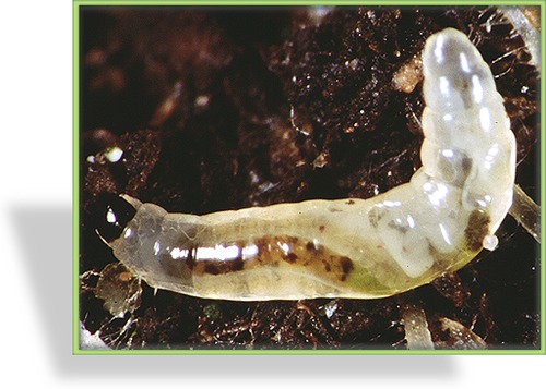 Die SF-Nematoden dringen in die Trauermückenlarven (auf der Abbildung gezeigt) ein und sondern dort ein Bakterium ab, das die Trauermückenlarven zum Absterben bringt.