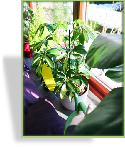 Pflanzen, die mit Trauermücken befallen sind, mit der Nematodenflüssigkeit gießen. Hilfreich zur Unterstützung sind Gelbtafeln.