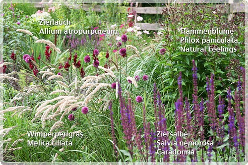 Diese Kombination aus früh blühendem Wimpernperlgras mit Zwiebelblumen (Alliums) und Ziersalbei ist einfach unglaublich verführerisch!