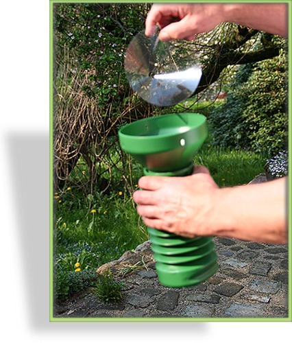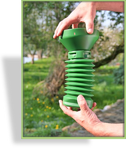 Damit die Falle auf dem Rasen nicht umkippt, können Sie in den grünen Zieharmonika-Rumpf Sand oder schwere Steine einfüllen.
