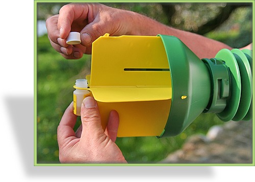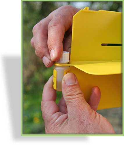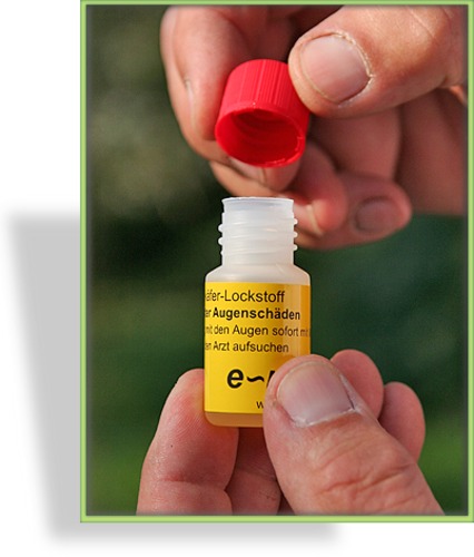 Der nach Heu, Geranien und Nelken duftende Lockstoff entströmt der kleinen Flasche, deren Deckel perforiert ist.